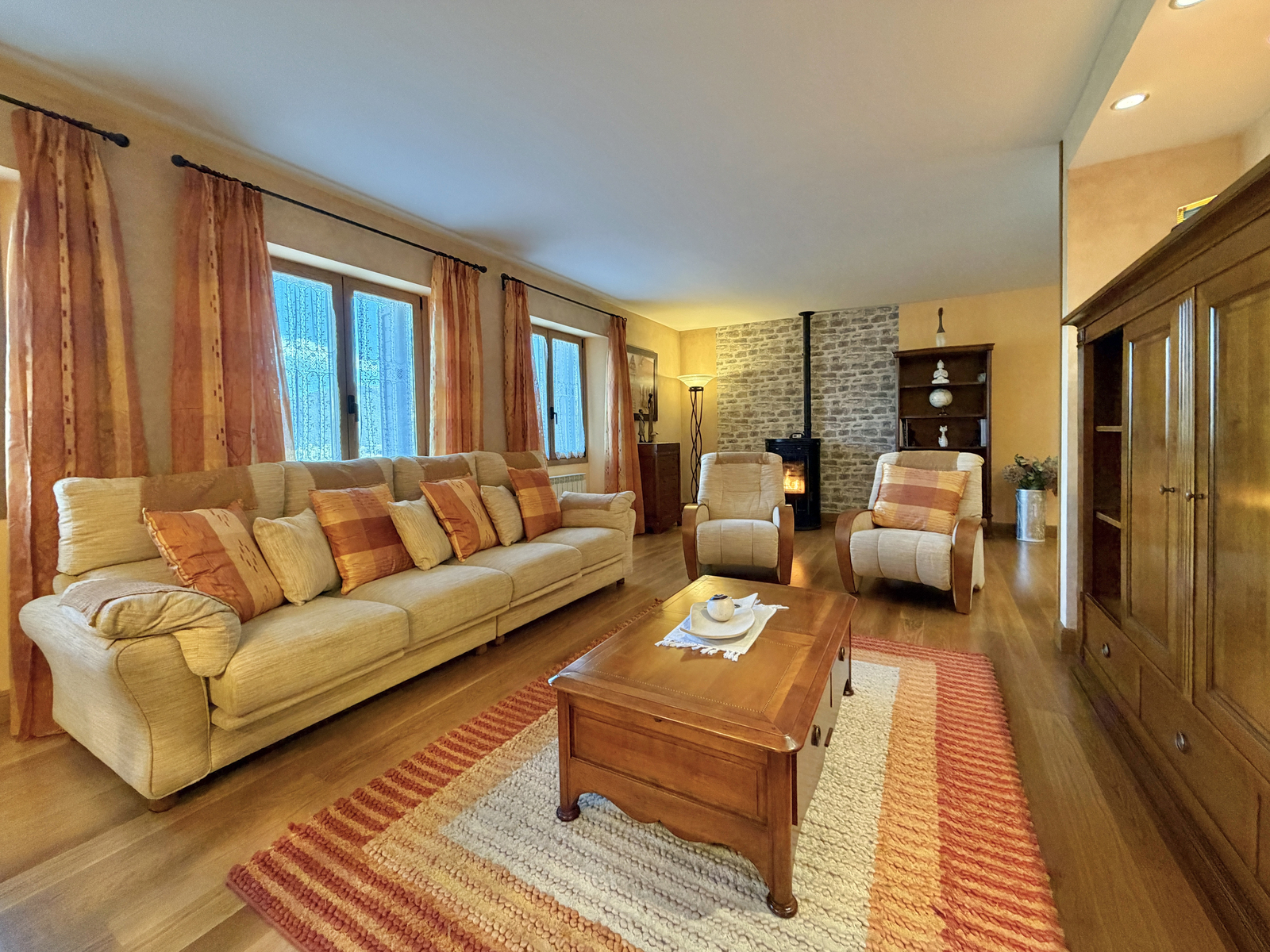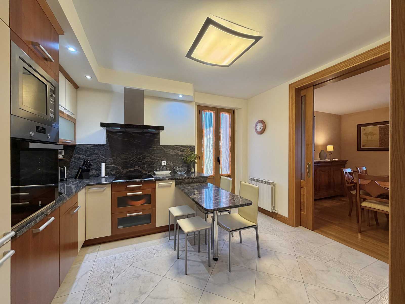 En la primera planta se encuentran las zonas comunes de la casa. La estufa de la planta hace que la estancia abierta del comedor, salón y zona de juego sean más acogedoras. La cocina está completamente equipada con todo tipo de pequeño electrodoméstico (tostadora, batidora de vaso…) para que la estancia sea más cómoda; así como un completo menaje para 18 personas que permitirá reunirse a todos ocupantes de las dos viviendas. Esta planta también ofrece su propio aseo completamente equipado.